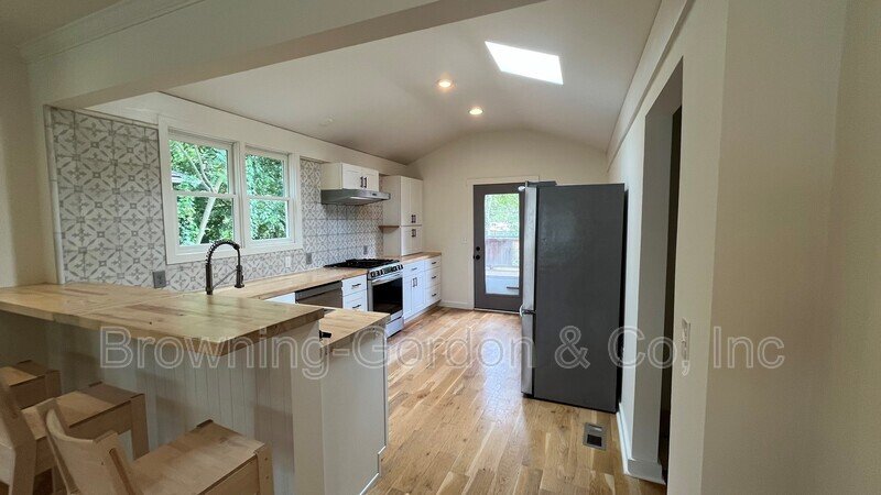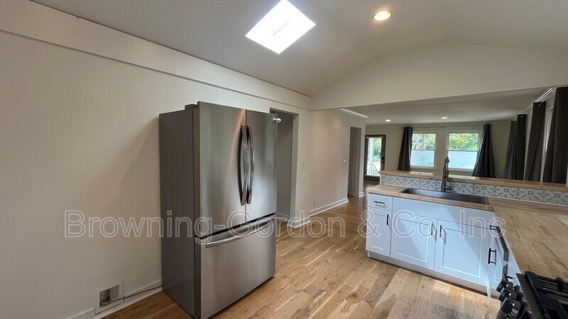 The entryway features plenty of natural lighting, with a wood floor to match the butcher block countertops, and leads to an open concept kitchen with skylight for an extra spacious feel. The kitchen wields a clean, classic look with modern appliances—french door fridge, farm-style sink, and gas stove—tied together with white cabinetry and peaceful view of the foliage next door.